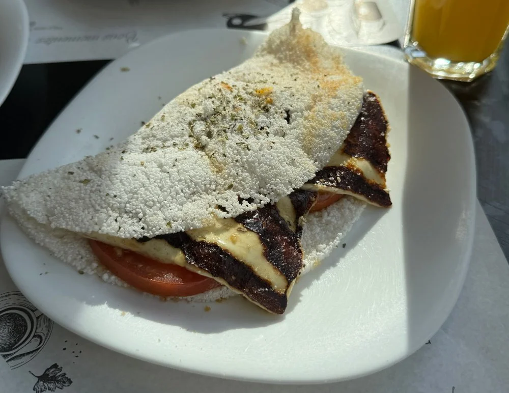 naleśniki z tapioki wypełnione jajecznicą lub mozarellą z pomidorem i oregano;